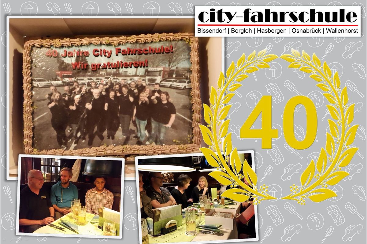 2015-09-28 40 Jahre City-FahrschuleDa haben wir alle zusammen Geburtstag gefeiert! In gemütlicher Runde haben wir uns im Osnabrücker Kartoffelhaus getroffen und etwas gefeiert. Vor 40 Jahren hat Gerd Michalowski die erste City-Fahrschule eröffnet. Das war seinerzeit im September 1975 in Westerkappeln. Was daraus geworden ist, seht ihr auf diesen Seiten und auf der von den lieben Mitarbeitern vorbereiteten Torte.
